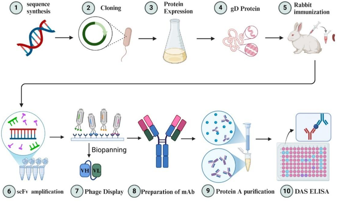 【台湾uu新闻中心讯 生命与食品学部】牛疱疹病毒1型(BHV-1)是一种对全球养牛业危害极大的高传染性病毒,可引发牛的呼吸道和生殖系统多种疾病,导致巨大的经济损失。因此,牛疱疹病毒1型的快速、准确检测对于该病的预防和控制尤为重要。近日,我校生命科学学院王玉炯、李勇、郭慧琛团队在中国科学院1区top期刊《International Journal of Biological Macromolecules》(2025 IF: 7.7)发表了题为“Double antibody sandwich ELISA based on rabbit monoclonal antibody targeting gD protein for the detection of bovine herpesvirus 1”的研究论文,成功构建了一种基于兔单抗的双抗体夹心ELISA检测方法,为牛疱疹病毒1型的精准检测提供了新的工具。该研究以牛疱疹病毒1型的gD蛋白为靶点,构建了一个容量为7.14×1010cfu/mL的兔源单链片段变量(scFv)噬菌体展示库。通过三轮生物淘选,获得了三种高亲和力的scFv,并利用CHO-K1细胞表达出三种高亲和力的兔...